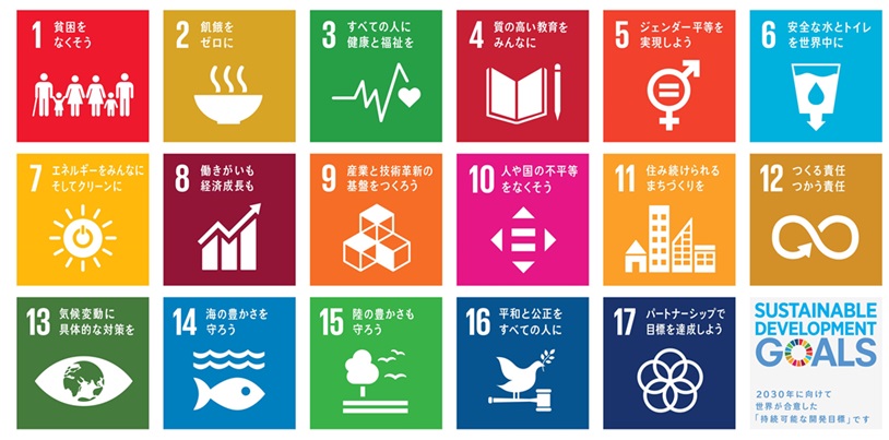 SDGs 持続可能な開発目標 (Sustainable Development Goals)は、2016年から2030年の15年間で達成すべき“世界共通の目標”として、2015年9月に国連で開催された持続可能な開発サミットで国連に加盟している全193カ国によって採択されました。