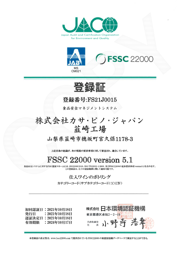 韮崎工場が国際規格のFSSC22000の認証を取得しました。