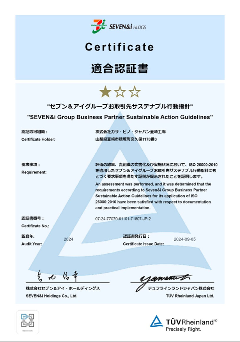 この度、弊社はお客様の「サステナブル行動指針」に評価され、適合認証書を頂きました。