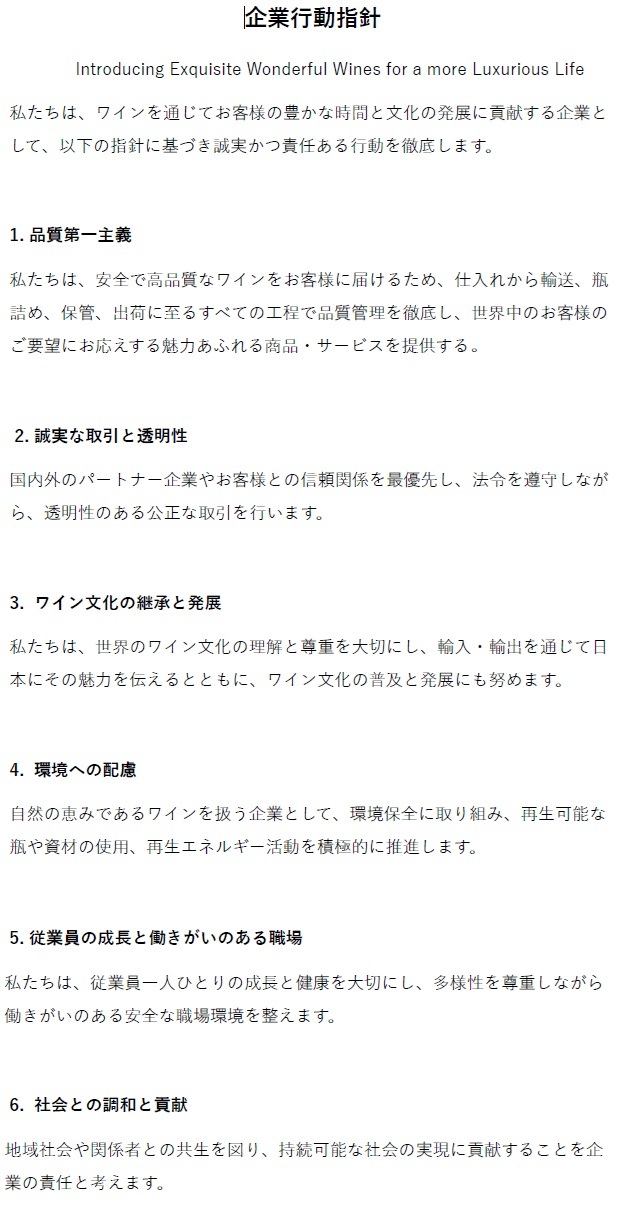 | 事業内容 | 酒類の輸出・輸入・製造・卸業・販売事業 インターネット通販事業 その他の事業(各種貿易・ビジネスコンサルタント・委託加工・バルク商品・PB商品開発) |