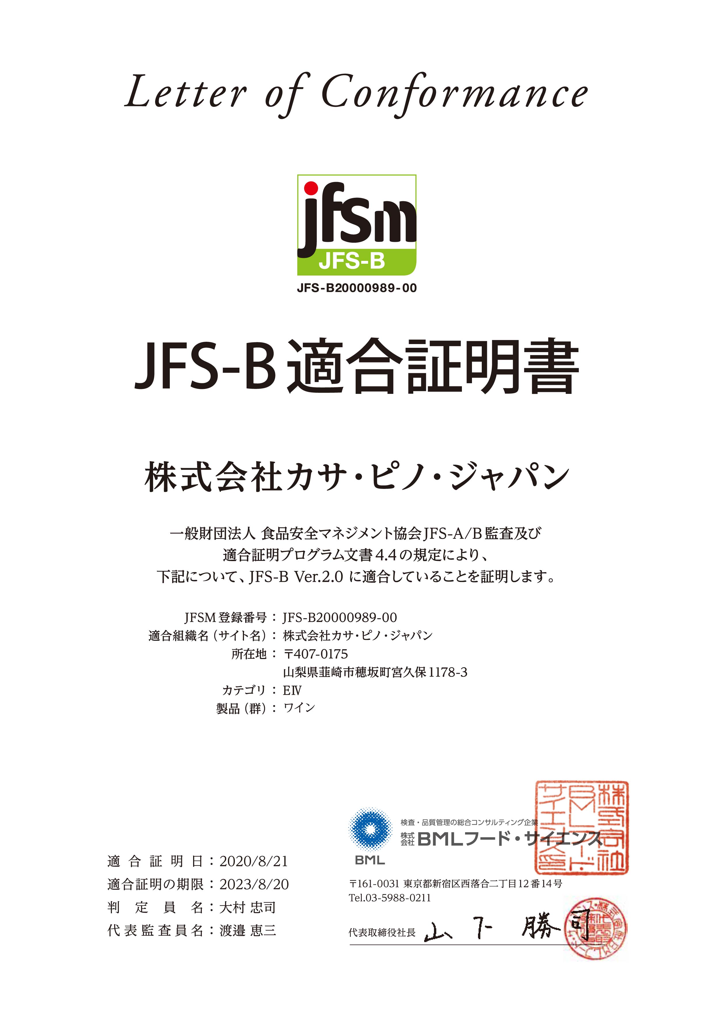この度、一般財団法人食品安全マネジメント協会の監査を受けた結果、JFS-B規格の適合証明を頂きました。
